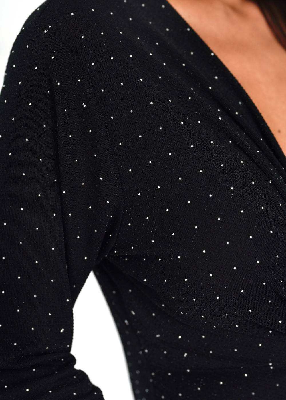 Faustina to błyszcząca sukienka, która zachwyca elegancją i kobiecym krojem. Delikatne drobinki na materiale subtelnie odbijają światło, a rozcięcie na nogę dodaje zmysłowości. Dopasowany fason i drapowanie w talii pięknie podkreślają sylwetkę. Idealna na wieczorne wyjścia i przyjęcia.