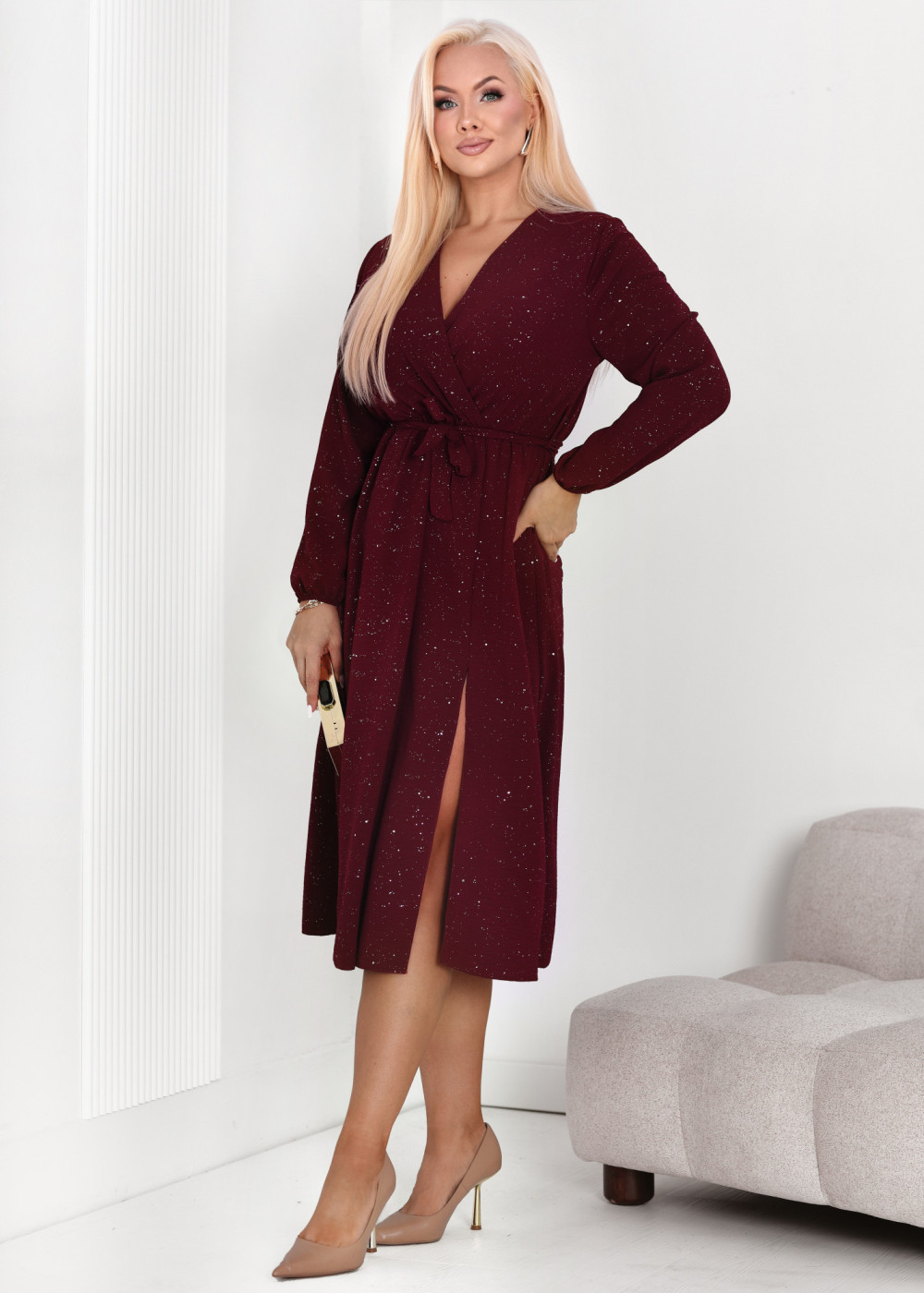 Sukienka Camila przyciąga spojrzenia subtelnym połyskiem i kobiecym krojem. Błyszczący materiał nadaje jej elegancji, a gumka i wiązanie w talii podkreślają figurę. Zmysłowe rozcięcie na nodze dodaje lekkości i pewności siebie – idealna propozycja na wieczorne wyjścia i spotkania.