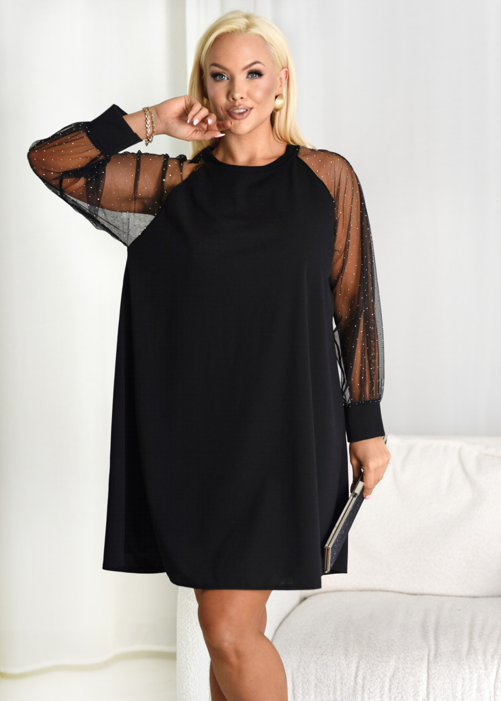 Sukienka Claire zachwyca nowoczesnym krojem i subtelnym blaskiem. Luźny fason oversize gwarantuje komfort i swobodę, a transparentne rękawy z drobnymi kryształkami dodają elegancji. To model, który łączy prostotę z szykiem – idealny na wiele różnych okazji.