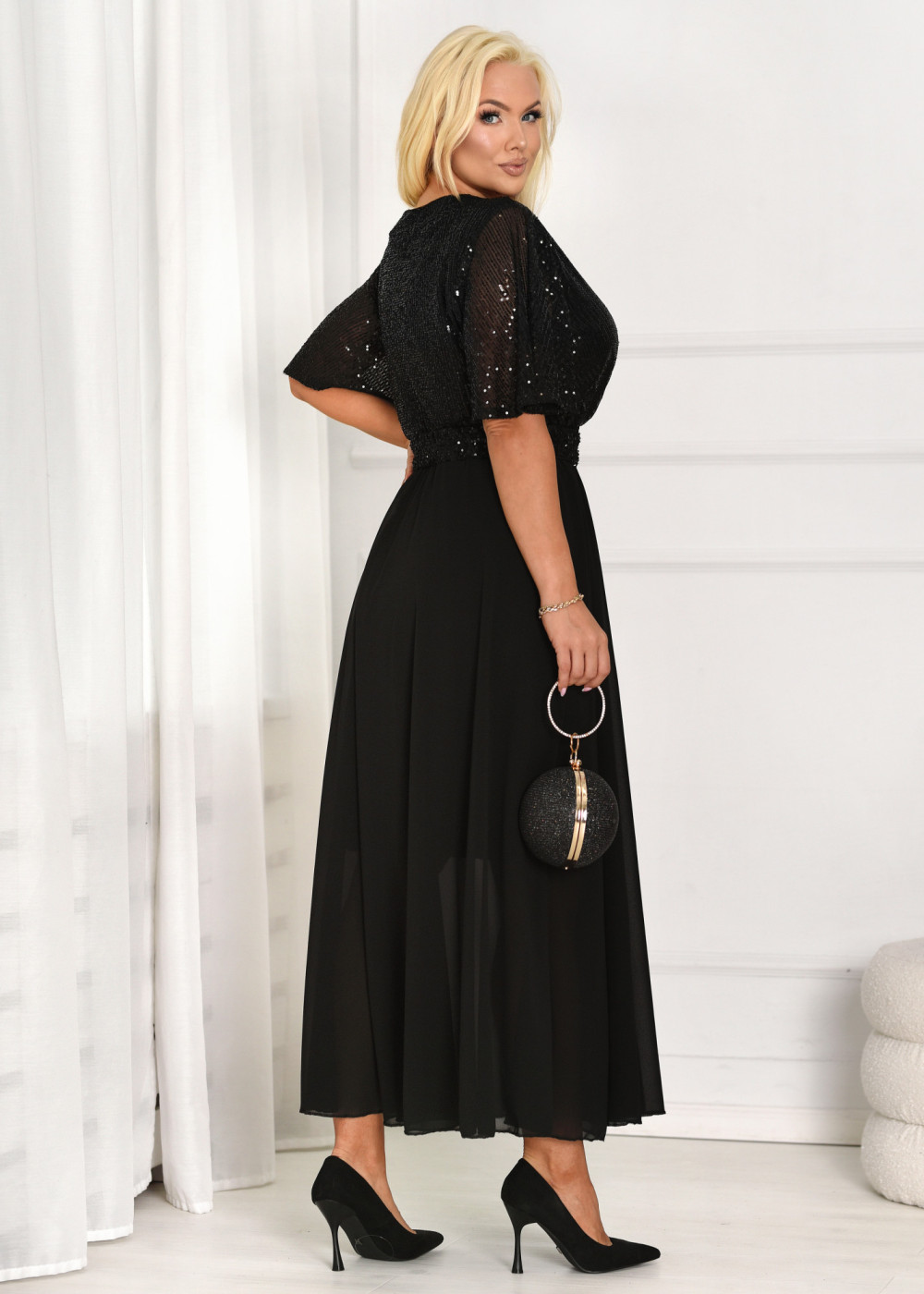 Sukienka Angelina to kwintesencja kobiecego stylu. Góra pokryta cekinami dodaje blasku, a pasek w talii podkreśla kształty. Zwiewny, lekko rozszerzany dół o długości maxi tworzy elegancką całość, idealną na uroczyste kolacje, bale i wyjątkowe okazje.