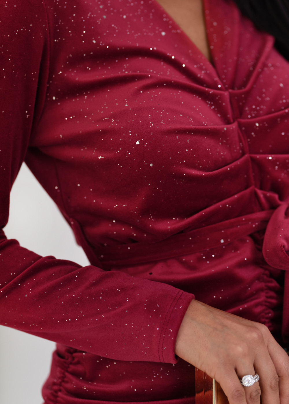 Sukienka Noemi to propozycja, która świetnie łączy zmysłowy styl z wygodą. Welurowy materiał ozdobiony drobnymi kryształkami dodaje blasku, a efektowne marszczenie pięknie modeluje sylwetkę. Wiązanie w talii podkreśla kształty, tworząc elegancki, wieczorowy look.