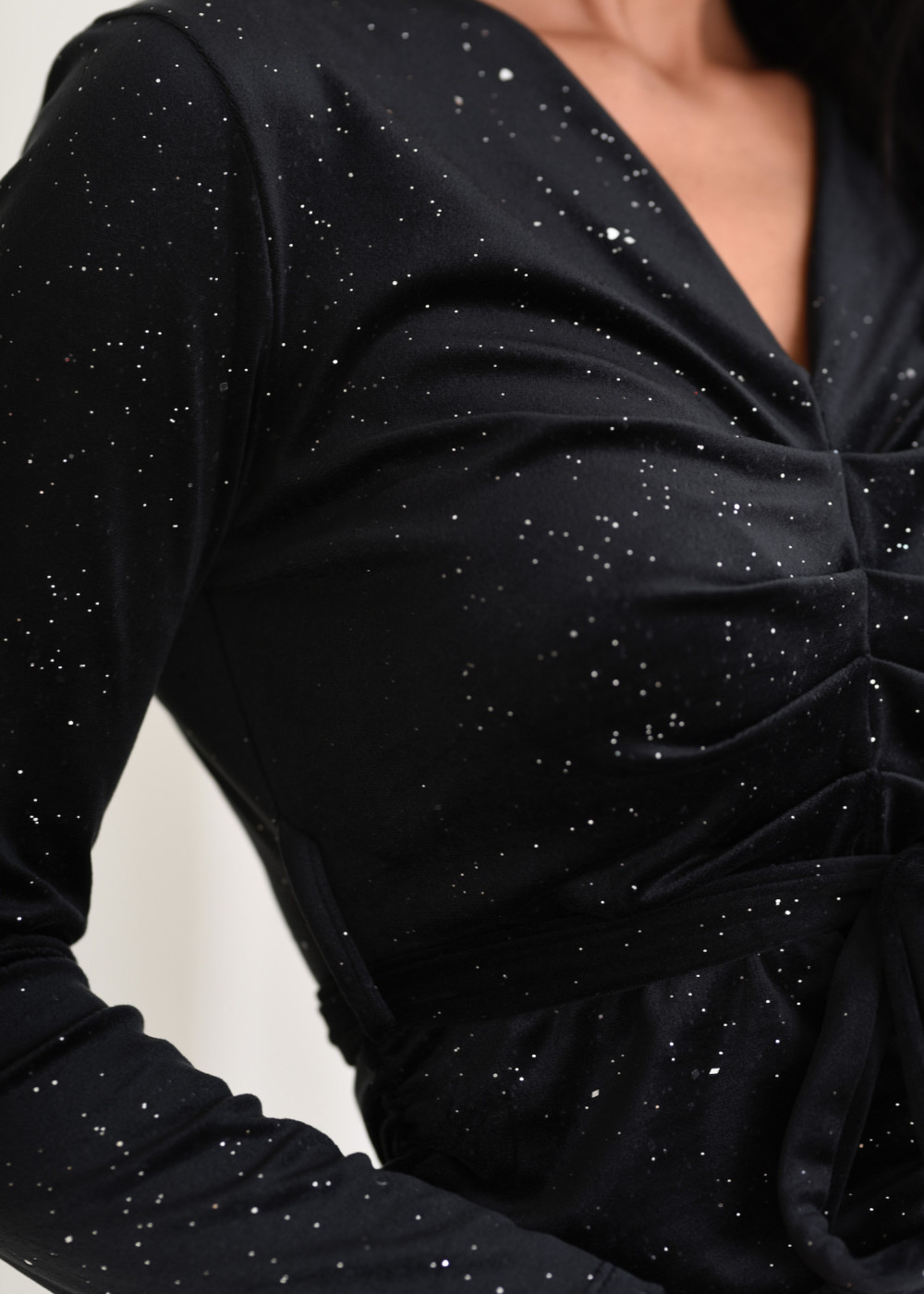 Sukienka Noemi to propozycja, która świetnie łączy zmysłowy styl z wygodą. Welurowy materiał ozdobiony drobnymi kryształkami dodaje blasku, a efektowne marszczenie pięknie modeluje sylwetkę. Wiązanie w talii podkreśla kształty, tworząc elegancki, wieczorowy look.